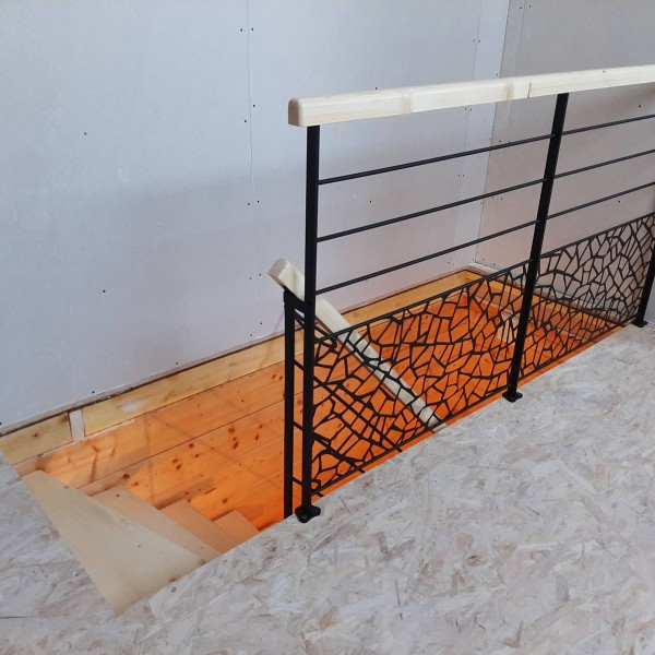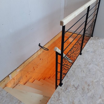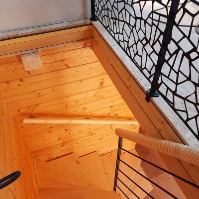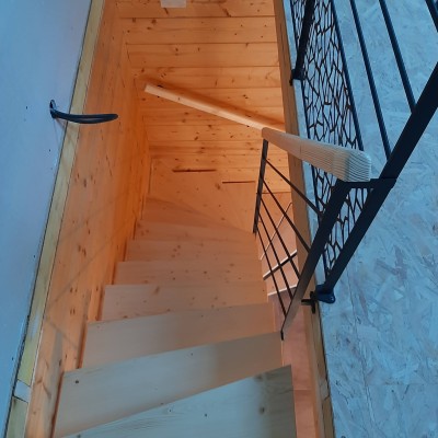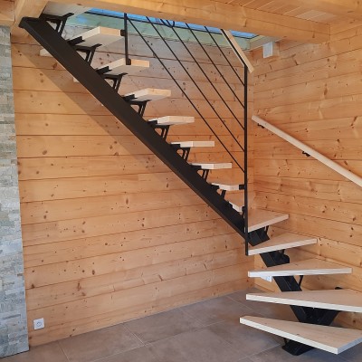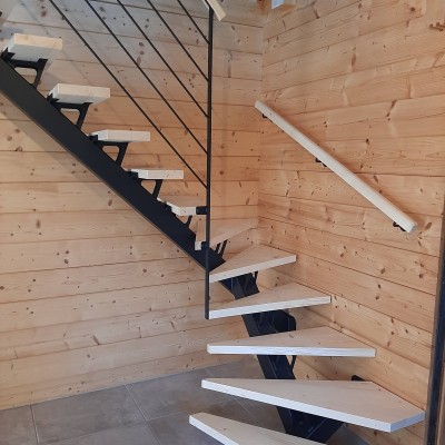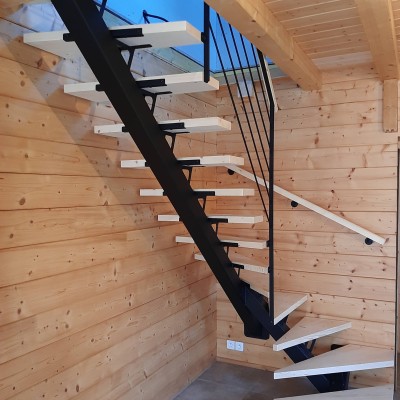 Escalier 2/4 tournant Bois Métal limon central. Structure métallique mécano-soudée laquée noir mat RAL 9005. Marches sapin du nord massif vitrifiés incolore finition ciré. Main courante sapin du nord massif. Garde corps avec remplissage tôle à motif.
